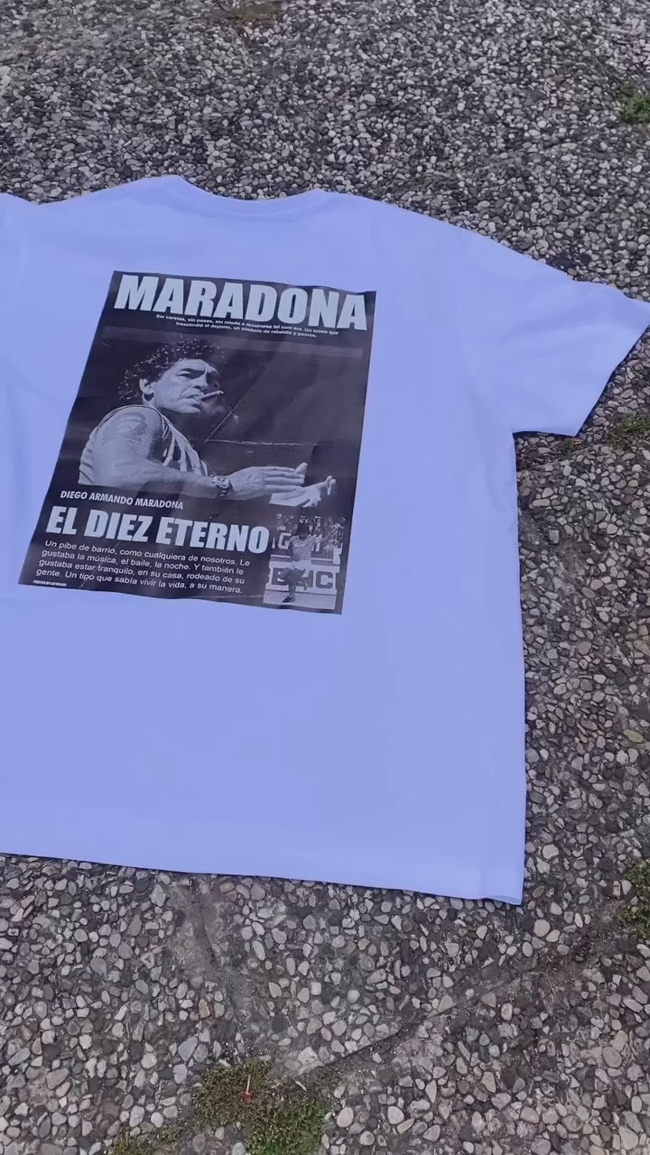 Diego Armando Maradona. Sul petto, il nostro logo discreto ma deciso. Sul retro, una breve e intensa storia dedicata al "Dios" del calcio, per portare sempre con te la sua leggenda.